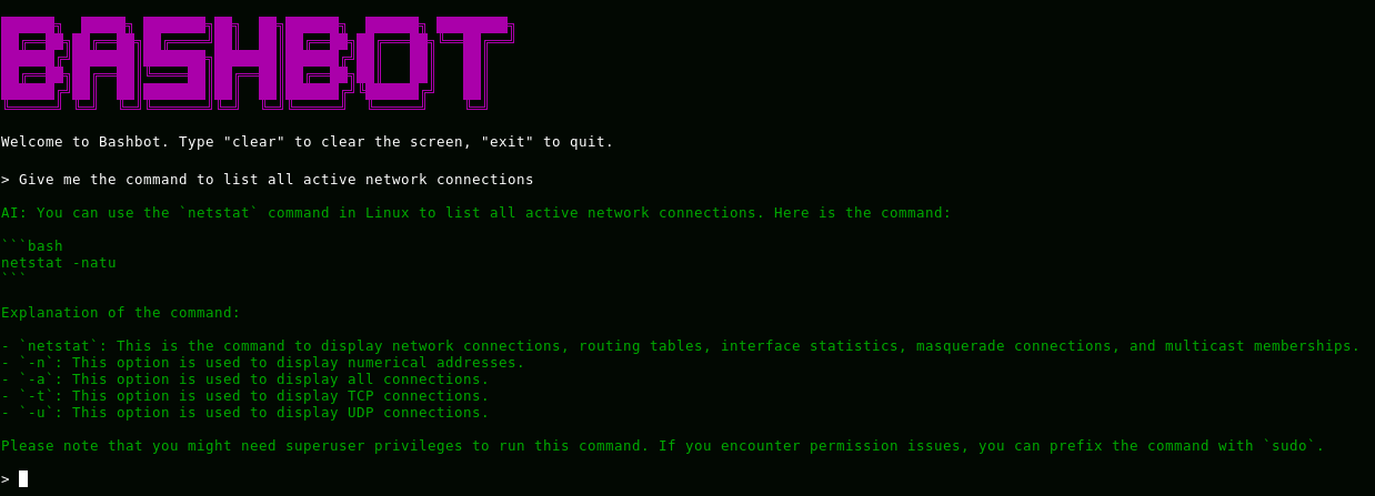 Bashbot is a script that allows you to interact with an AI-powered chatbot from the Linux terminal. The chatbot is a Cloudflare Worker that is set up to use the deepseek-coder-6.7b-instruct-awq LLM.