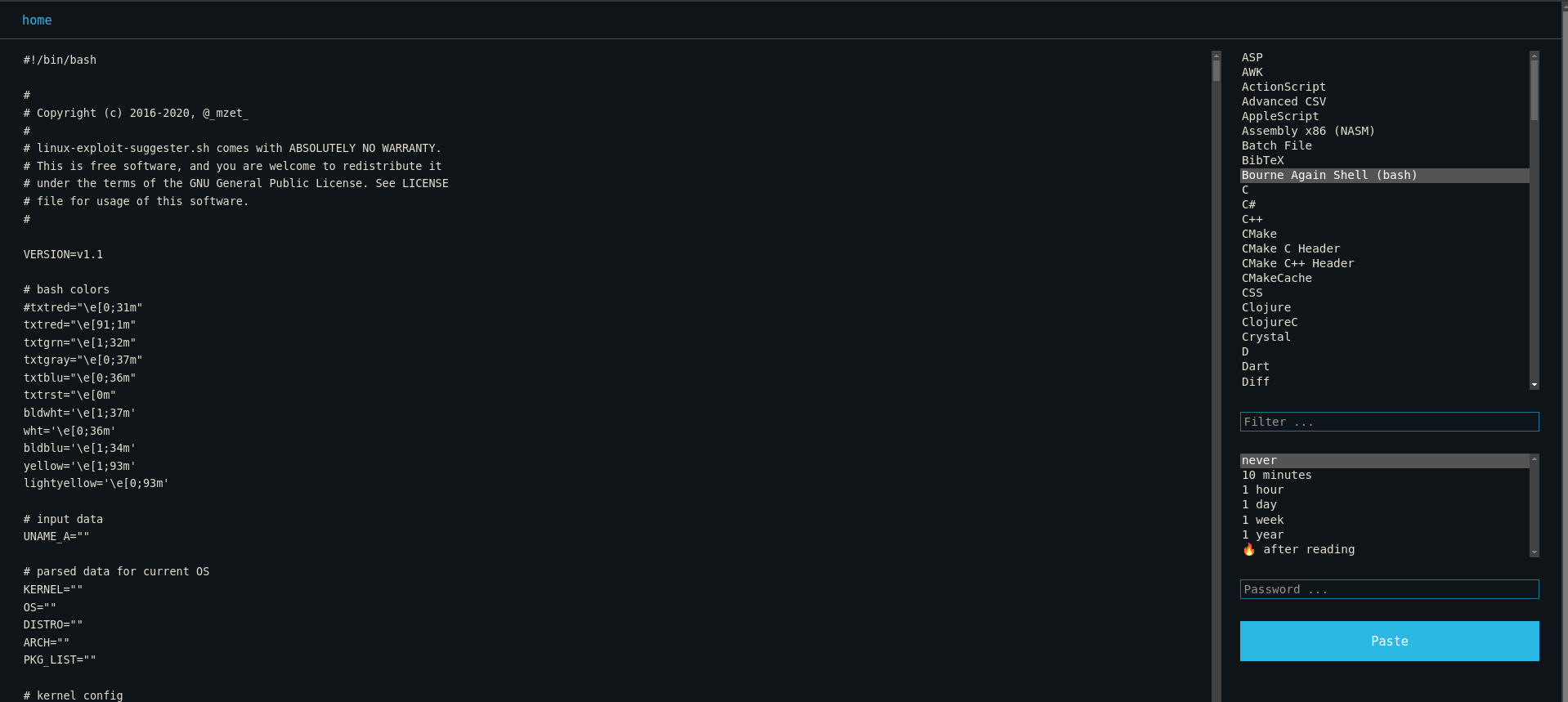 Really cool pastebin application. Features code syntax highlighting for dozens of programming languages, encrypted pastes, self-destructing pastes, and a super clean user interface.