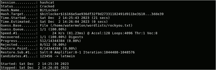 Attempting a dictionary attack using the same hardware and the very popular rockyou.txt wordlist that contains 14 344 391 passwords.