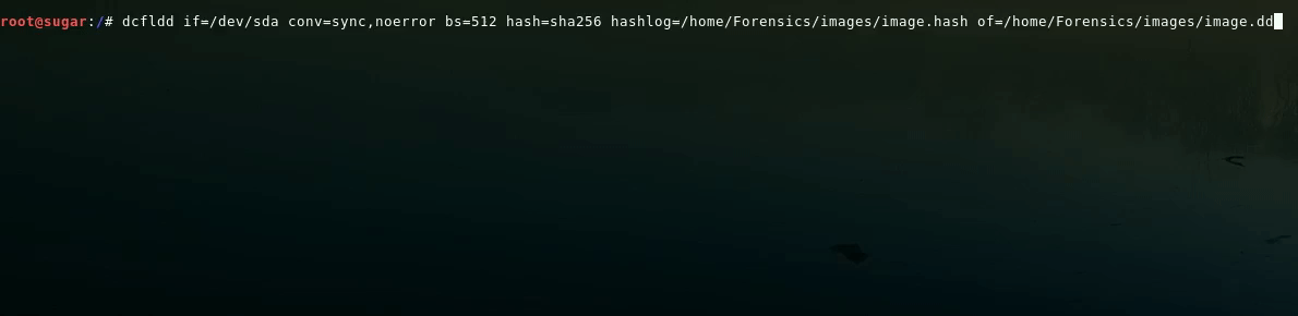 dcfldd if=/dev/sda conv=sync,noerror bs=512 hash=sha256 hashlog=/home/Forensics/images/image.hash of=/home/Forensics/images/image.dd