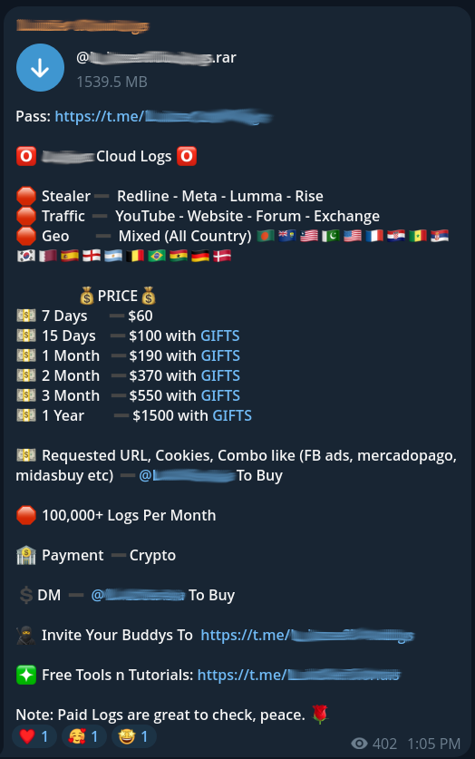 The Big Fish are cybercriminals who develop infostealers and offer them, or their log files, as a service to the Little Fish. They are highly sophisticated and technically literate, capable of creating malware that evades antivirus detection. They operate Telegram channels, like the one shown in the screenshot below, providing paid access to infostealer logs or the malware itself.