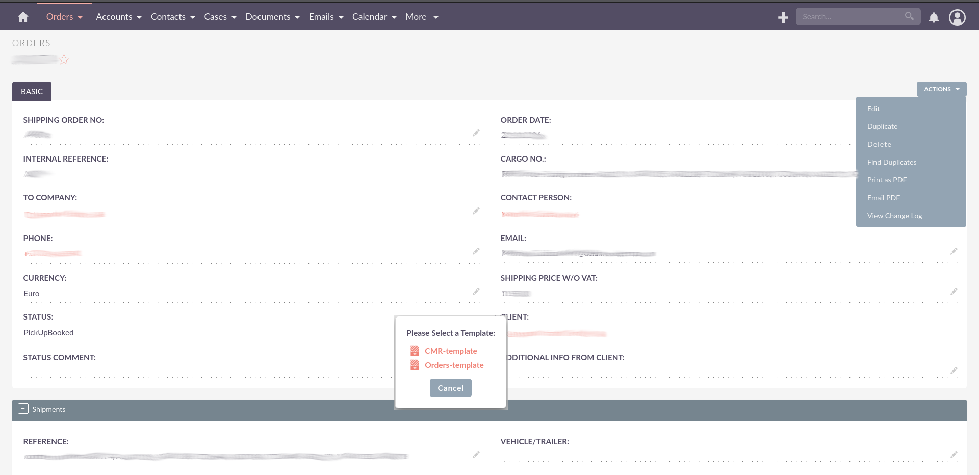 Kad esam pievienojuši jaunu pasūtījumu mums ir iespēja no šīs informācijas uzģenerēt PDF dokumentus, mūsu gadījumā divus – pasūtījuma kopsavilkumu un CMR (starptautiskais transporta dokuments). Tāpat mums ir iespēja šos dokumentus uzreiz nosūtīt e-pastā pasūtījumā norādītajai kontaktpersonai. Visiem lauciņiem varam iespējot audita funkciju – jebkuras izmaiņas lauciņā, tiks atspoguļotas izmaiņu žurnālā (changelog), kuram turpat ērti varam piekļūt.