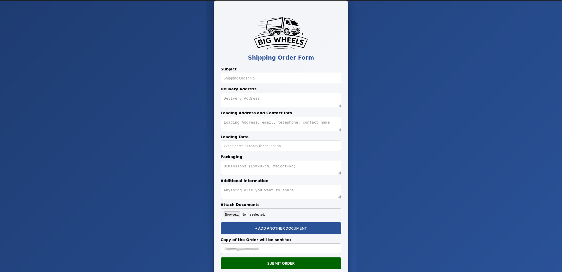 Klientu webforma ir vienkārša HTML forma, kur klienti var ievadīt informāciju, pievienot dokumentus un šos datus iesniegt, tā ir draudzīga mobilajām ierīcēm. Brīdī, kad klients piespiež pogu “Submit Order”, no ievadītās informācijas tiek izveidots jauns pasūtījums, tāpat par to tiek izsūtīts epasta paziņojums.