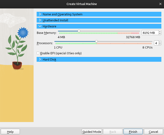 I recommend going through the virtual machine’s settings it specially checking out the “Display” and “Network” sections. It may be a good idea assigning more video memory and disabling network, atleast for the first boot.