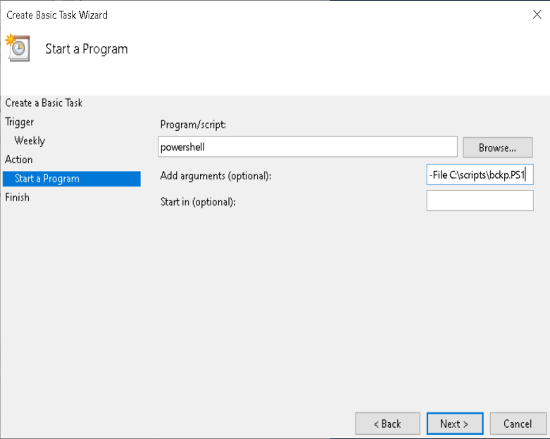 Set up the name, description and trigger. At the “Action” dialog choose the option “Start a program” and point PowerShell to your script: